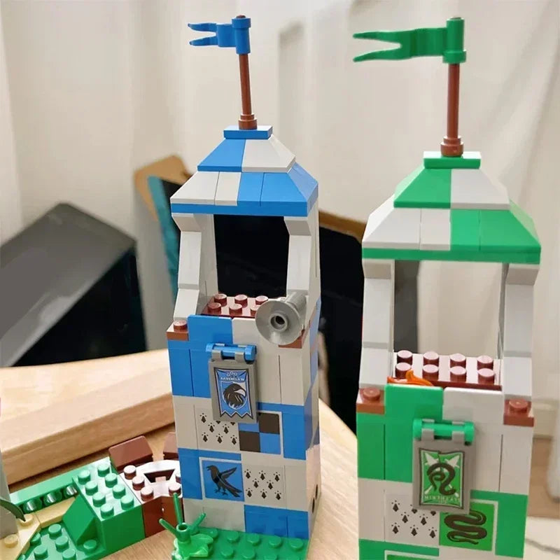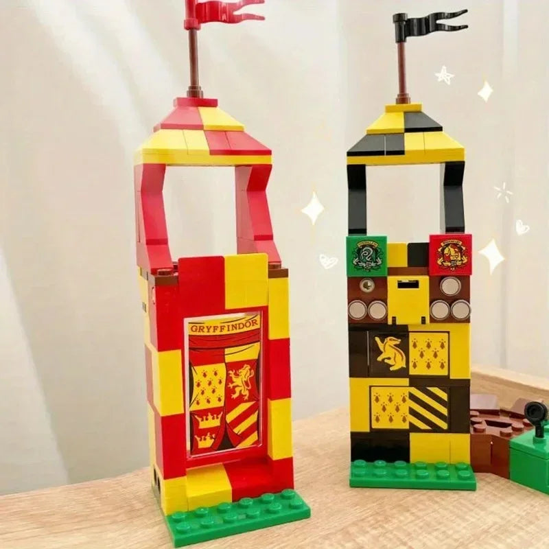 Detalhes fiéis: Réplicas detalhadas dos veículos e construções, incluindo as torres das casas de hogwarts no cenário de quadribol.