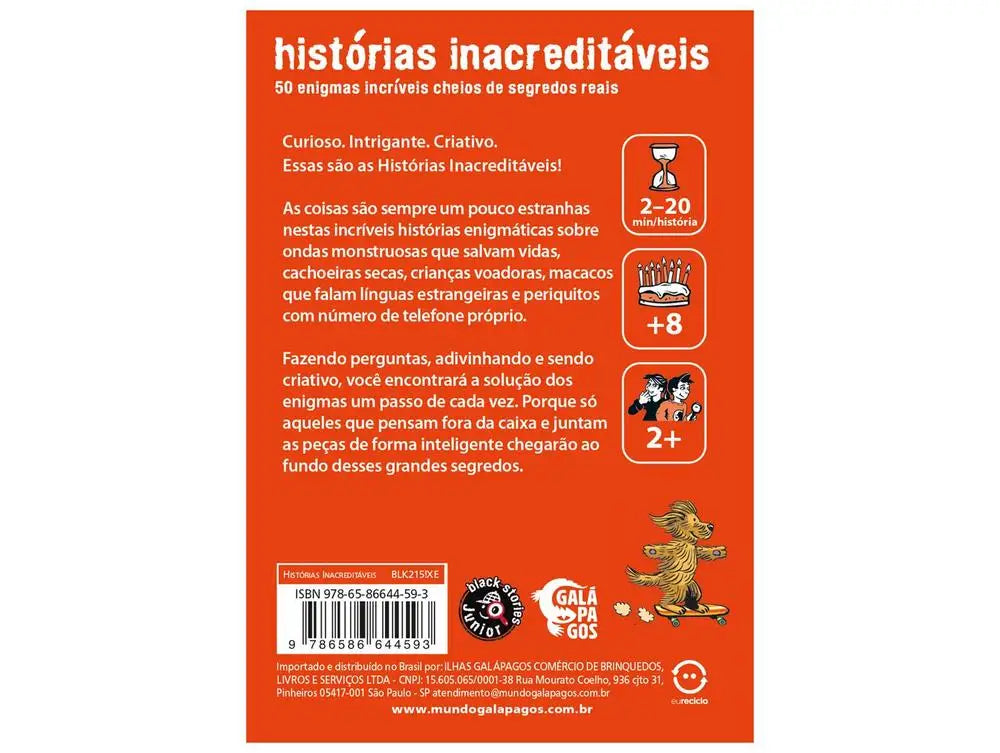 Cansado de jogos sem emoção? Prepare-se para ouvir (e desvendar) histórias tão loucas que são inacreditáveis – mas são reais! O Jogo de Cartas Histórias Inacreditáveis da Galápagos Jogos é um desafio de raciocínio, lógica e trabalho em equipe. Seu objetivo é resolver 50 enigmas incríveis, onde você precisará reconstruir a história completa fazendo as perguntas certas. É a atividade ideal para reunir a família e os amigos e estimular o desenvolvimento cognitivo e a imaginação das crianças.